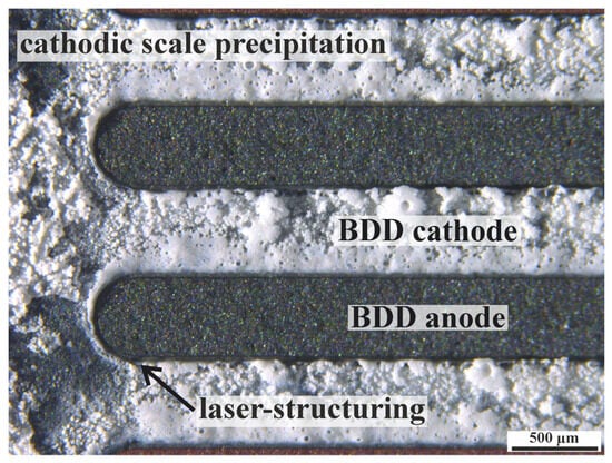 The iDDE has been shown to be a reasonable addition to existing standard electrode systems, especially in poorly conductive electrolytes (κ < 350 µS/cm). Even applications in ultra-purified water (κ = 0.05 µS/cm) become possible at acceptable voltages and energy consumptions (refer to S5). Alternative electrode setups for comparable treatment requirements feature the use of a zero-gap reactor design based on microporous materials []. The iDDE technology can thus contribute to closing the gap for the treatment of poorly conductive water matrices via BDD. The concept of an all-diamond electrode also allows polarity reversal during EAOP, which enables the removal of pH-dependent precipitates by switching the polarity. The iDDE anode can be clearly distinguished from the cathode during scale formation (comp. Figure 7). The option to switch polarity could increase the service life of an iDDE, as the cathodic load can be split up between two electrodes over time. In this case, alkaline pH, hydrogen evolution, and cathodic deposits (scale) are regarded as cathodic loads for both the ceramic substrate and the BDD coating.