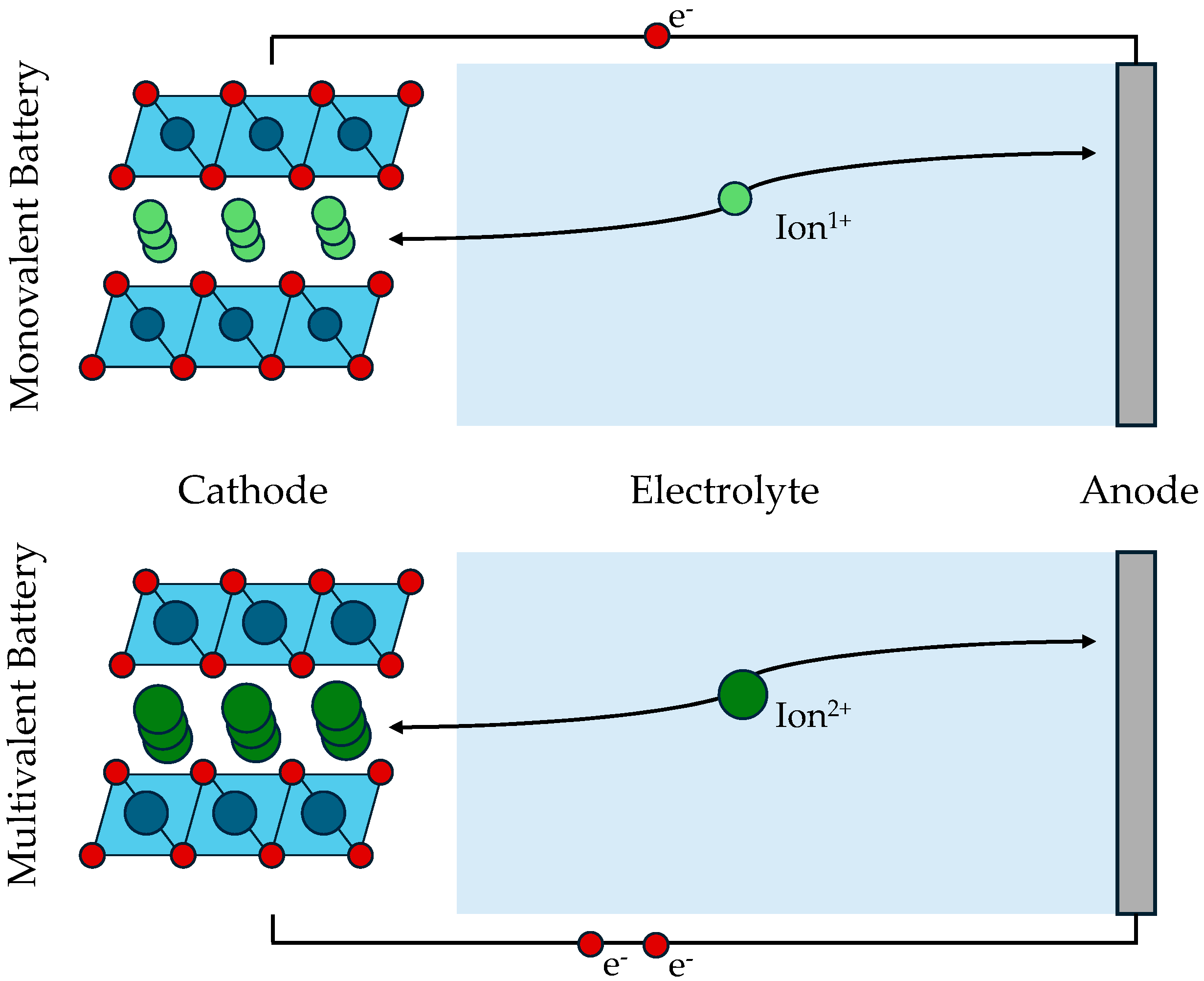 MVIBs are a compelling alternative to lithium-ion by using ions that carry two or more charges such as Mg2+, Zn2+, and Al3+ to enhance energy density and storage efficiency. These ions offer a higher charge-to-volume ratio than monovalent Li+, enabling more compact and efficient storage. For example, aluminum can deliver three electrons per ion with a volumetric capacity of 8046 mAh cm−3, exceeding that of lithium-based systems.