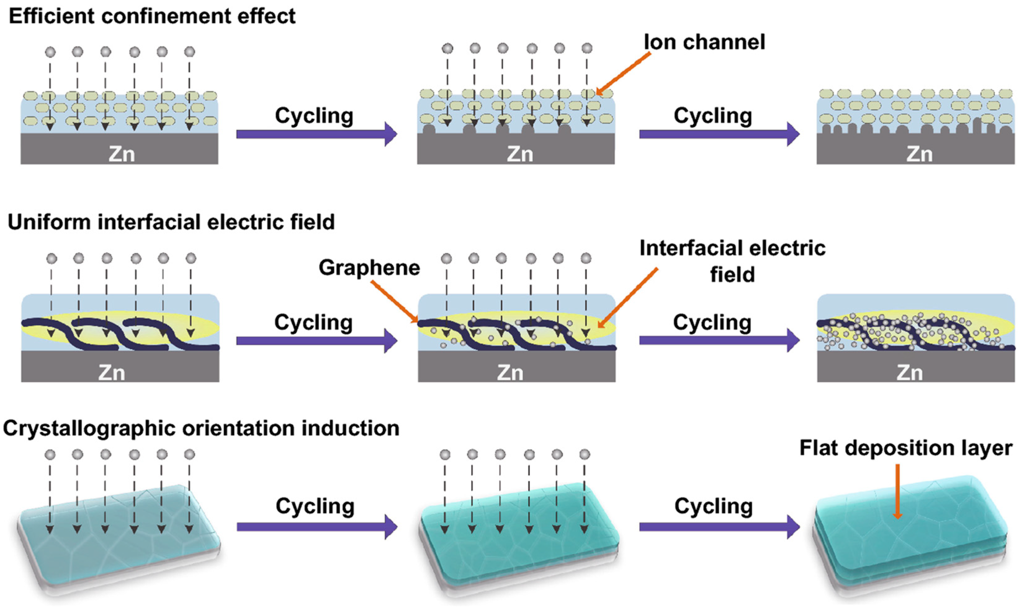 As summarized by Li et al., interfacial-engineering approaches mitigate these instabilities through mechanisms such as ion-flux confinement, uniform electric-field distribution, increased nucleation-site density, electrostatic shielding, and crystallographic-orientation control [