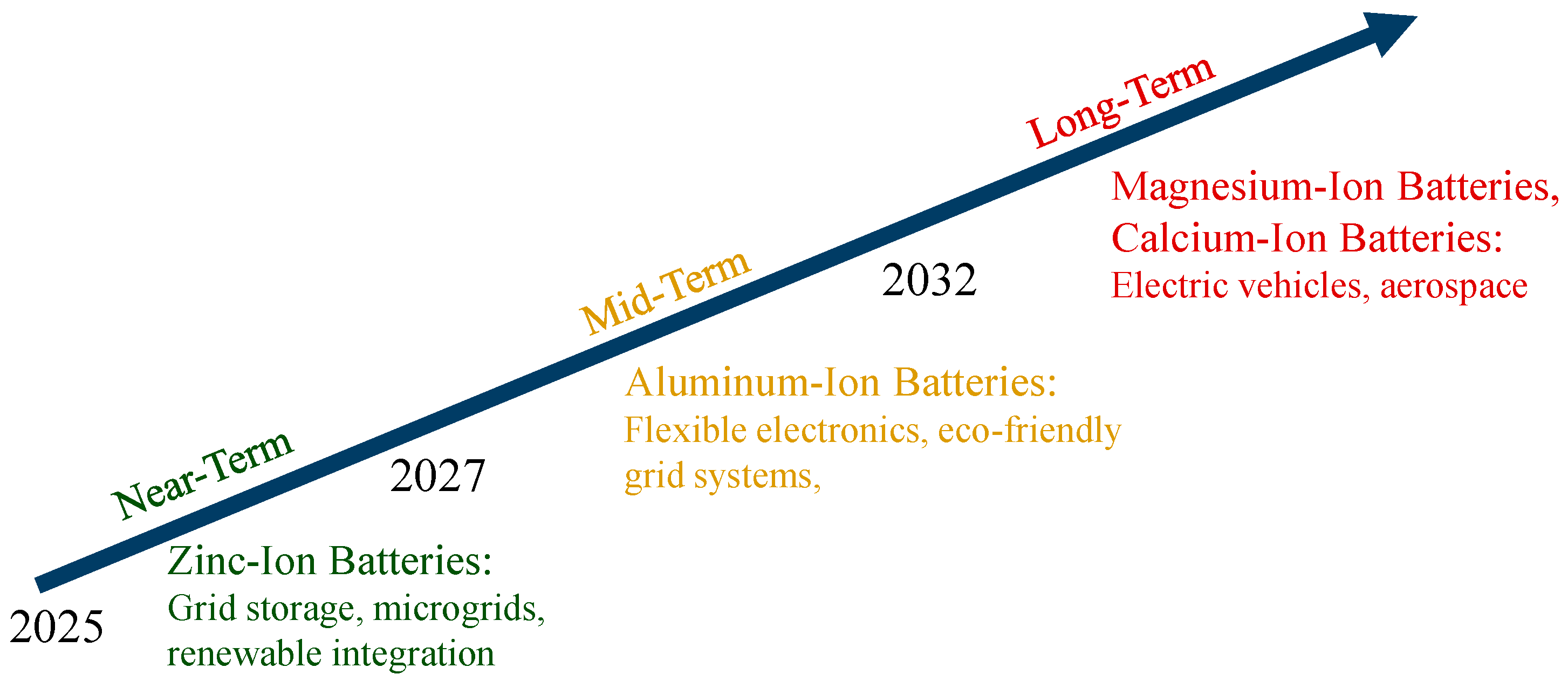 Scaling multivalent-ion batteries to industrial production faces technical, economic, and safety obstacles that shape the projected adoption timelines shown in
