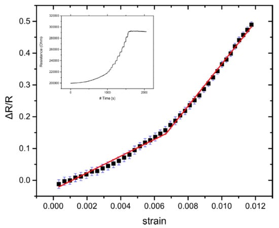 Measurement of resistance during gradual application of strain. Relative resistance over strain graph, where the GF is calculated by the slopes of the fitting line. Error bars represent the standard deviation of the measurements. In this particular example, the sensor has GF1 ~26 for lower strains and GF2 ~66 for higher strains. Inset picture shows the sensor’s actual “step-like” response to gradual strain application. Reprinted from []