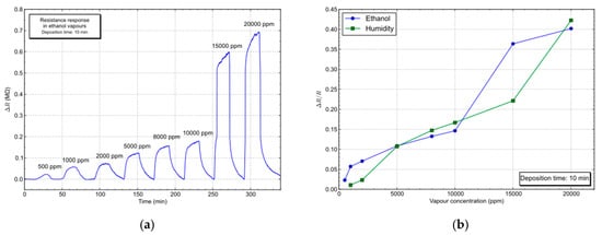 (a) Transient resistance response to humidity, for a hybrid Pt NP/polymer chemical-sensor, realized after a nanoparticle deposition of 10 min in ethanol (b). Relative resistance response of the same sensor in humidity and ethanol. Reprinted from [], with permission from Elsevier.