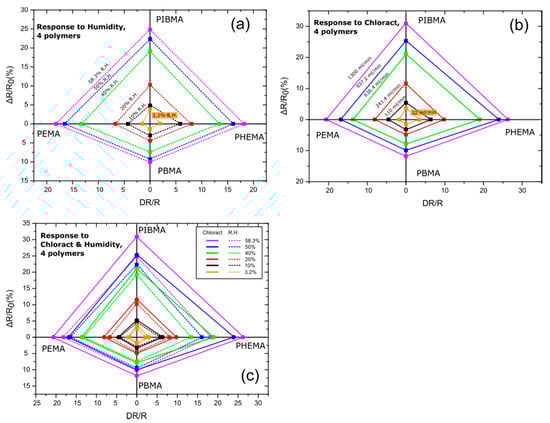 Distinctive fingerprint-patterns after the response of hybrid Pt NPs/polymer based sensors with all four different polymeric coatings towards (a) relative humidity (RH) from 3.2% to 58.3% (b) Chloract test-solution, for N2 carrier-gas flows from 32 to 1300 mL/min (identical N2 flows with the ones used to achieve R.H. from 3.2% to 58.3%) and (c) combined response to both analytes. Reprinted from [], with permission from Elsevier.