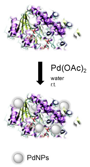 Here, we describe the synthesis of high stable heterogeneous Pd nanocatalysts (enzyme/PdNPs biohybrids), where NPs were created in situ from an aqueous solution containing an enzyme and a noble metal salt (Figure 1) [20]. Different enzymes, such as scaffolds, were tested evaluating their role in the metal reduction, stabilization of nanoparticles, and remaining biocatalytic activity.
