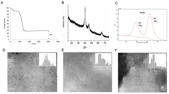 Characterization of the palladium-nanoparticles (PdNPs) biohybrids synthesized using CAL-B. (A) TGA of the PdNPs-1 biohybrid after 24 h of incubation. (B) XRD analysis. (C) XPS. (D) TEM image of PdNPs-1. (E) TEM image of PdNPs-2, (F) TEM image of PdNPs-3.