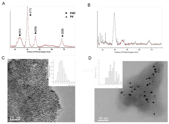 Therefore, the effect of Pd nanoparticles formation using TLL was first evaluated. The protocol used in the synthesis was based on using methanol as a co-solvent for the synthesis, maintaining the same amount of protein per Pd. As previously with CAL-B, a solid was obtained, so called PdNPs-4. The ICP-OES analysis showed that the amount of Pd in this case was slightly higher (35%). The XRD pattern surprisingly demonstrated that Pd(0) was not the only metal species, containing also PdO in this case (Figure 3A). The TEM analysis revealed that the PdNPs synthesized were 2–4 times larger than using CAL-B (Figure 3B).