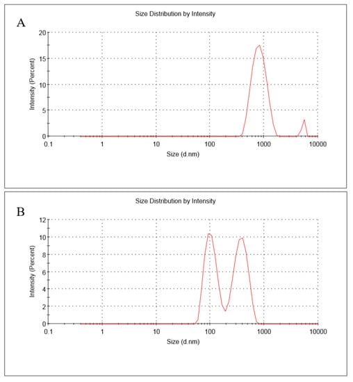 To certify the presence of the CS NPs in the solution and evaluate their size division, the solution of CS NPs was analyzed by the DLS method after the sonication. The results show that the chitosan particle size before sonochemical process ranged above 1000 nm Figure 1A as compared to the size of CS NPs at selected concentration that ranged between 100–600 nm as shown in Figure 1B.
