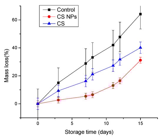 Effect of CS and CS NPs edible coatings on the mass loss of strawberries stored at 4 °C and 80–85% relative humidity (error bars indicate standard deviation).