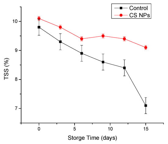Changes in total soluble solids (TSS) of strawberries during the storage period at 4 °C (error bars indicate standard deviation).