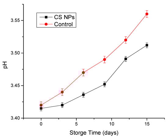 The pH reflects the changes of organic acid content in fresh fruit during storage. The pH value increased during the storage period in general, which was corelated to fruit aging and microorganisms growing in an acid substrate when their metabolic activity made the medium less acidic with high pH value. The changes in pH value of strawberries coated with CS NPs and uncoated strawberries during the 15 days of cold storage at 4 °C are shown in Figure 5.