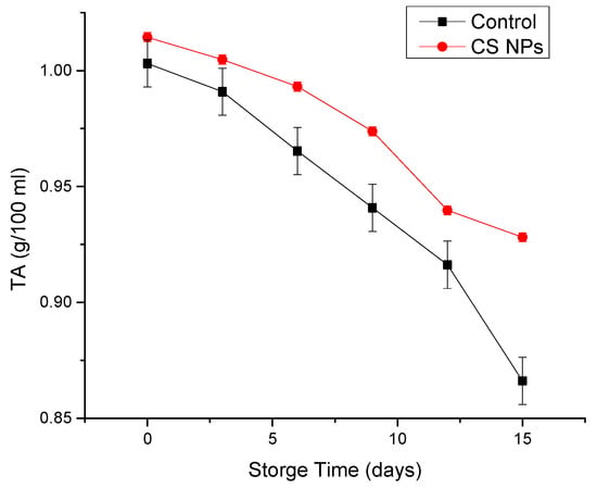 Effect of CS NPs edible coating on the titratable acidity (TA) of strawberries during the storage at 4 °C (error bars indicate standard deviation).