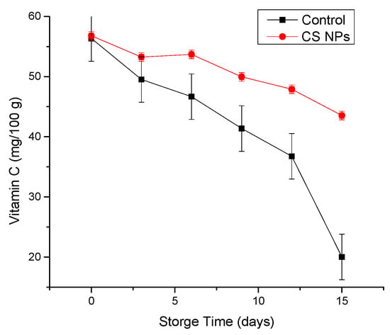 The effect of CS NPs, on the content of L-ascorbic acid (Vitamin C) of strawberries during the cold storage at 4 °C (error bars indicate standard deviation).