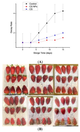 (A) Effect of CS NPs edible coating on decay rate of strawberries stored at 4 °C. (B) Images of decay rate of strawberries throughout the storage. Up: Strawberries coated CS NPs, Down: Control strawberries (error bars indicate standard deviation).