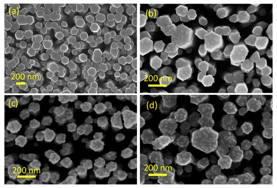 Figure 1 displays the FE-SEM images of the (a) bare ZnO NRs and (b–d) the heterostructures with a different layer thickness of MoS2 sheath; (b), (c), and (d) correspond to Μο-1.5, Μο-5 and Μο-10, respectively. The 1D rod-like ZnO structures are clearly observed in all cases. The average diameter of ZnO NWs is approximately 120 nm, while their length is ~1 μm. FE-SEM images reveal that the initially smooth surface of the ZnO NWs (a) attain a textured form due to the growth of the MoS2 sheath. The effect becomes progressively more evident as the nominal Mo thickness increases from 1.5 to 10 nm. The formation of the sheath is apparent for all thicknesses of pre-deposited Mo films. In the case of Mo-5 nm and Mo-10, FE-SEM reveals the growth of islands, especially on the top of the rods.