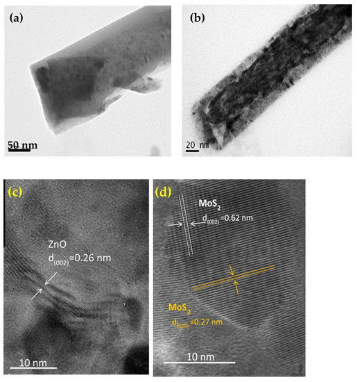 TEM images (a) a ZnO NW and (b) a ZnO/MoS2 core/sheath heterostructure. HRTEM of (c) ZnO and (d) hexagonal MoS2 showing the crystal planes (002) and (100).