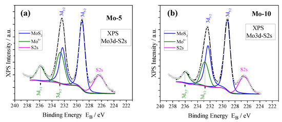 The photocurrent of the Mo-5 sample exhibits presents reliable stability up to 1400 s, presumably due to the sacrificial polysulfide electrolyte as Na2S acts as a hole scavenger. As it has already been reported elsewhere [44,45], this type of electrolyte diminishes photocorrosion of the catalyst’s surface, while aqueous electrolytes, such as KOH or Na2SO4, lead to surface dissolution. It is worth mentioning that the stability in the current study extends to much longer periods than those reported in previous PEC investigations, i.e., 600 s in [31] and 500 s in [33].