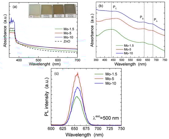 Optical properties of the ZnO/MoS2 heterostructures were investigated using UV-Vis absorption and PL spectroscopies. Figure 4a shows the UV-Vis absorption spectra of the bare ZnO nanorod array (dashed line) and the ZnO/MoS2 heterostructures. The color change from light to dark colored when the Mo film thickness increases is visible in the optical images shown in the inset. This causes a slight increase in the absorption curves at the visible wavelengths. Because the thickness of the MoS2 shell around ZnO is very low (few monolayers), only the absorption of ZnO in the UV region (~380 nm) becomes dominant. To observe the fine details of absorption peaks of MoS2 in the visible region, MoS2 films were grown on bare FTO glass substrates by sulfurizing pre-deposited Mo thin films with the same nominal thicknesses, i.e., 1.5, 5 and 10 nm. These MoS2 samples on a bare FTO exhibit two peaks (PA and PB) at 675 and 625 nm, as shown in Figure 4b. These two excitonic peaks correspond to the “A” and “B” transitions between the split maxima of the valence band and the conduction band minimum at the K point of the Brillouin zone [18]. The band near 440 nm, for the sample grown using 1.5 nm of Mo, corresponds to the transition “C” assigned to the van Hove singularities in the electronic density of states [42].