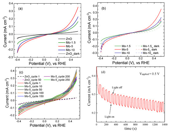 Figure 6d displays the photocurrent response of the Mo-5 sample for several on–off cycles at an applied potential of 0.5 V vs. RHE under chopped illumination. When illumination commences, a sharp increase in the current response is increased, which is attributed to the photogeneration of charged carriers. The current response in the dark does not approach the zero values, indicating that ZnO/MoS2 heterostructures also exhibit electrocatalytic behavior in accordance with their high values of dark currents, shown in Figure 6b.