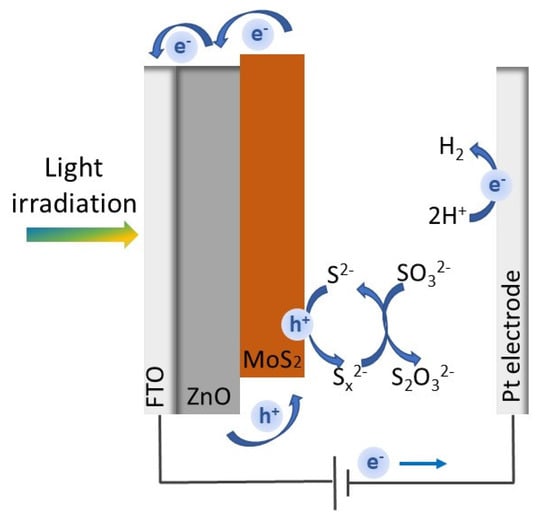 The ZnO/MoS2 heterostructure is essentially a p-n junction where energy band alignment takes place at the interface. The reactions describing the water-splitting process in the current case are depicted by the reactions (1) to (4). The absorption of photons with energy close or higher than the optical bandgap causes the creation of electron–holes pairs (reaction 1). The electrons transport through the ZnO NWs to the FTO substrate and then are transferred through the external circuit to the Pt counter electrode to induce hydrogen production. The holes travel to the semiconductor/ electrolyte interface and react with ions from the electrolyte molecules to form (reaction 2). The ions from Na2SO3 reduce to (reaction 3), and they can react with to generate (reaction 4) to prevent sulfur deposition.