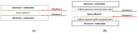 Finally, the joining region is composed of several interphases, as shown in Figure 2. For the reference joints (Figure 2a), the overlap area includes two interphases formed by the two aluminum plates, in contact with the adhesive. For the electrochemically processed metallic adherends, the interphase of the overlap region includes the metallic substrate, the alumina nanotubes layer formed on its surface, and the adhesive, as schemed in Figure 2b. Nanotubes are shaped during the electrochemical anodization in a very thin nanometer scale layer on the surface of the metallic plate. It is expected that this nanotubes layer builds up a more robust and complex interphase structure.