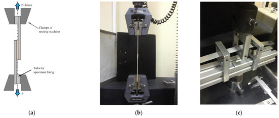 The apparent shear strength of the adhesive was determined through tensile loading of the joint, as indicated by ASTM D1002-01, using an Instron 4301 (High Wycombe, UK) universal mechanical testing machine. The adhesive shear strength τ was calculated as the maximum shear stress achieved in an adhesive layer, based on recorded maximum tensile forces for each tested joint as given by Equation (1).
