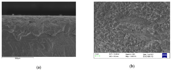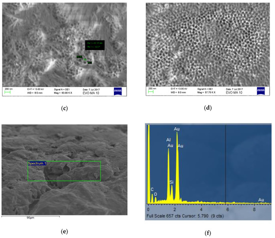 By applying the above-mentioned protocol of hard anodization, an alumina nanotubes layer (Figure 4d) was shaped on the aluminum plates. The surface topography of the substrate after the several anodization steps of the protocol may be seen in Figure 4a–c. Nanotubes cannot be seen clearly prior to ultrasonication (Figure 4c). The pore widening and the elimination of chemical traces from the electrolyte was achieved by applying this step of ultrasonication in 3 wt% H3PO4. As observed, nanotubes with a diameter between 50–60 nm formed over the entire analyzed surface. The diameters of the nanotubes can be adjusted by changing the anodizing parameters. The elemental analyses of the sample showed that the aluminum was industrial grade, and alloying elements were present; also, epoxy resin traces were found on the surface of the joining area (Figure 4f).