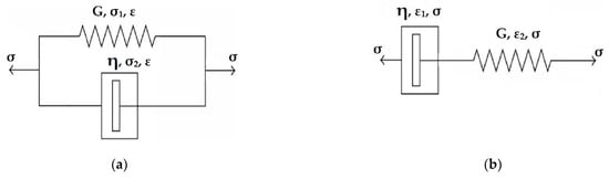 Next, it is assumed that the adhesive linear viscoelastic behavior is represented by the simple Voigt model shown in Figure 6a. The model exhibits an iso-strain behavior. Thus, the Voigt model constitutive equation is