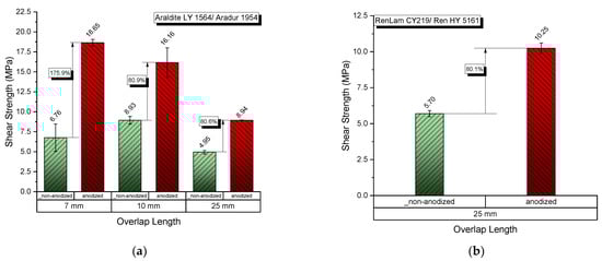 Analyzing Figure 7a, we may observe that all joints that were manufactured with anodized adherends in the case of the Araldite adhesive presented improved strength when compared with non-anodized ones, regardless of the overlap length. Specifically, the largest increase in the shear strength was observed in the specimens with an overlap length of 7 mm (175.9%). Subsequently, the 10 mm and 25 mm overlap lengths showed an almost similar increase in the shear strength of 80.9% and 80.6%, respectively.