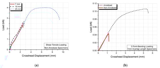 The above results can also be verified by the load–displacement curves shown in Figure 8. More precisely, the effect of overlap length on the tensile–shear load for non-anodized joints, as well as the effect of anodization versus non-anodization of single-lap joints loaded in a three-point bending mode, are shown.