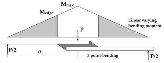 If the adhesive thickness is kept at 0.02 mm, and the joint width at 18 mm, the effect of increasing the overlap length is to increase the maximum load that can be taken by the joint before the crack initiates, as shown in Table 3. Since the bending moment in the three-point bending test varies linearly from zero to Mmax at the midpoint of the overlap length (see Figure 9), an increase in said overlap length would effectively reduce the bending moment at the edge of the overlap where failure initiates. The moment at the edge of the overlap (Medge) can be expressed in terms of the maximum moment (Mmax) at the center of the joint, the distance between the inner and outer supports (α), and the overlap length (lo):
