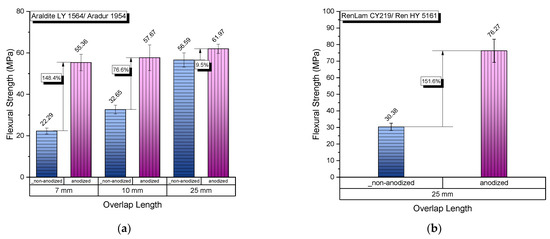 Comparative values of the mechanical properties of aluminum adhesive joints with non-anodized and anodized adherends: (a) flexural strength for Araldite adhesive; (b) flexural strength for RenLam adhesive.