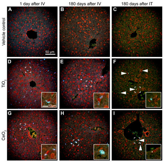 Liver tissue 1 and 180 days after intravenous (IV) or intratracheal (IT) exposure to vehicle control (A–C), TiO2 (D–F) and CeO2 (G–I) nanoparticles. Enhanced darkfield microscopy. (D,G): Agglomerates of foreign material (white) were distributed across liver sections 1 day after intravenous exposure and often appeared phagocytized by Kupffer cells (inserts in (D,G)). (E,H): 180 days after intravenous exposure, material was accumulated in fewer and larger agglomerates. (F,I): Agglomerates seen 180 days after intratracheal instillation were small and much less frequent (arrowheads). Scale bars in A and in the insert in D apply to all images.