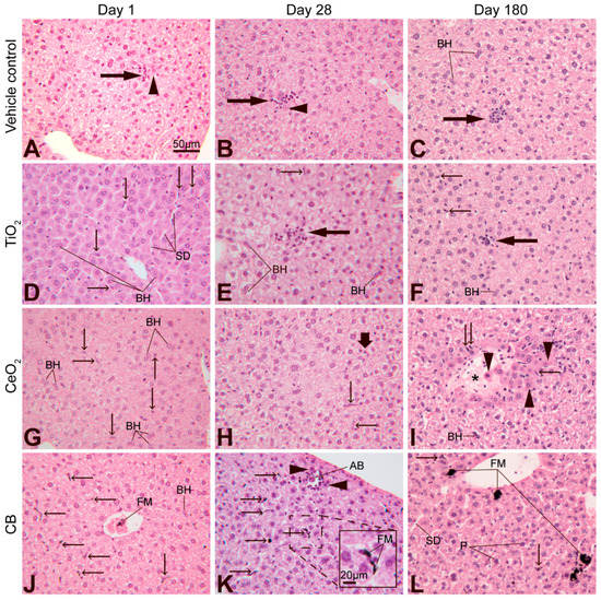 Microscopic changes in the liver of mice 1, 28 or 180 days after single intravenous injection of a vehicle (A–C), TiO2 (D–F), CeO2 (G–I) or carbon black (CB) (J–L) nanoparticles. Focal infiltration of inflammatory cells (long arrows); necrotic hepatocytes with distinct eosinophilic cytoplasm (arrowheads); binucleate hepatocytes (BH); cytoplasmic vacuolation (white spaces in hepatocytes); prominent nuclei of Kupffer cells (tiny arrows); sinusoidal dilatations (SD); area of necrosis (asterisk); hyperplasia of Kupffer cells (thick arrow); apoptotic body (AB); pyknosis of nuclei of hepatocytes (P); black foreign material (FM). HE stain, scale bar in A applies to all images.