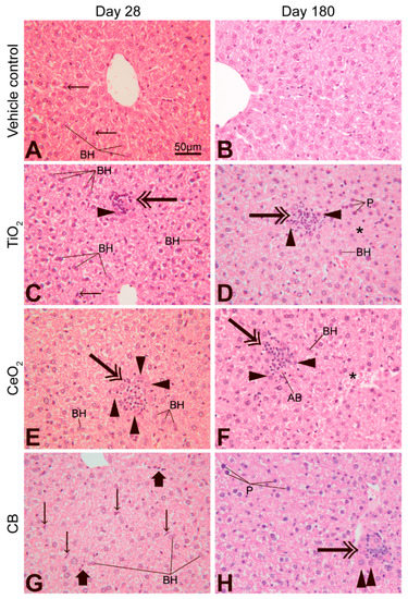 Microscopic changes in the liver of mice 28 (A,C,E,G) or 180 days (B,D,F,H) after single intratracheal instillation (IT) of a vehicle (A,B), TiO2 (C,D), CeO2 (E,F) or carbon black (CB) (G,H) nanoparticles. Prominent nuclei of Kupffer cells (tiny arrows); binucleate hepatocytes (BH); focal infiltration of inflammatory cells (double arrows); necrotic hepatocytes with distinct eosinophilic cytoplasm (arrowheads); pyknosis of nuclei of hepatocytes (P); cytoplasmic vacuolation (white spaces in hepatocytes); area of necrosis (asterisk); hyperplasia of Kupffer cells (thick arrows). HE stain, scale bar in A applies to all images.