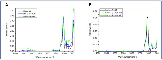 FTIR spectra of MCM–Si–M materials (M = Cu II, Ni II). Before (A) and after thermal treatment (B).