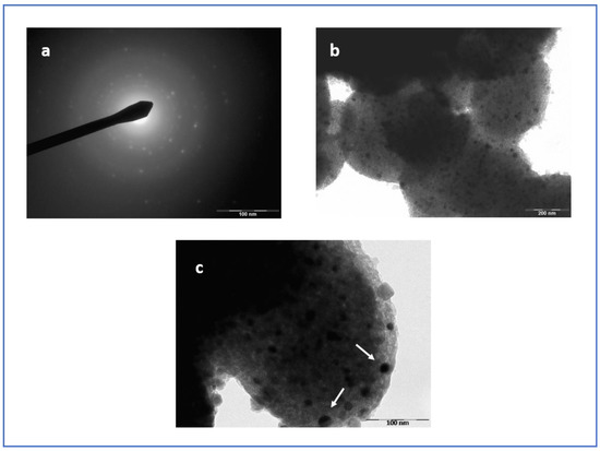 (a) SAED pattern; (b,c) TEM micrograph of MCM–Si–Cu–HT. The white arrows indicate NPs at the pore openings due to the extrusion of the metal, once reduced.