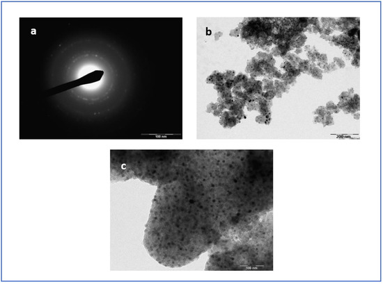(a) SAED pattern; (b,c) TEM micrograph of MCM–Si–Ni–HT. (b,c) illustrate clearly the homogeneity in size and in morphology of the Ni NPs despite the degradation of the support observed.