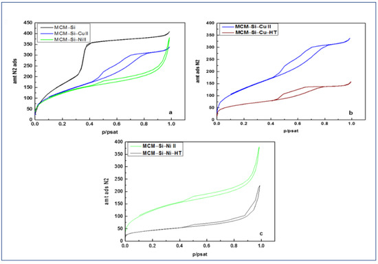 Nitrogen adsorption isotherms at −196 °C (77 K) for the different prepared materials. (a) MCM–Si and MCM–Si–M materials (M = Cu II, Ni II); (b) MCM–Si–Cu and MCM–Si–Cu–HT materials; (c) MCM–Si–Ni and MCM–Si–Ni–HT materials.