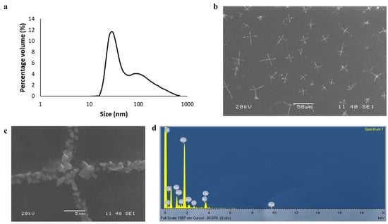 Gold nanoparticles are commonly prepared by the chemical reduction method []. Different plant extracts such as Hibiscus rosa-sinensis and Ocimum tenuiflorum have been used as reducing agents for the synthesis of gold nanoparticles from auric chloride [,]. Here, we synthesized a stable cruciform assembly of gold nanoparticles by using water extract from the leaves of Cannabis indica plants. We confirmed through dynamic light scattering that the particles prepared by our method were monodispersed (poly-dispersity index of 0.28) and nanosized (Figure 1a). The sizes and shapes of the nanoparticles were confirmed by scanning electron microscopy (SEM) experiments (Figure 1b,c). The SEM experiments revealed a rare cruciform assembly of the nanoparticles. The EDX analysis (Figure 1d) confirmed the presence of gold in the sample.