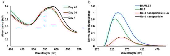 (a) Visible light spectra of gold nanoparticles measured over 45 days, proving their stability. (b) Tryptophan fluorescence emission spectra of BLA and the conjugates with tryptophan excitation at 280 nm.