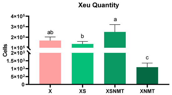 The quantification of the pathogen showed that Xeu was present in all inoculated experimental conditions. The results revealed that NMT was the only treatment capable of significantly (p < 0.05) reducing the Xeu amount in the tomato shoots (154 times) when compared to all the other conditions (Figure 1). When the EO-water emulsion (XS) or formulation (XSNMT) were applied, no significant differences were observed in the Xeu amount, compared to control (X), 24 h after treatments.