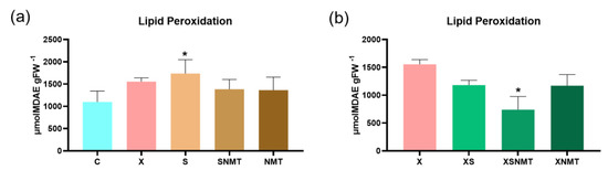 MDA content of S. lycopersicum shoots 3 days after Xeu inoculation, and 24 h after the application of treatments; (a) represents the uninfected/treated conditions (S; SNMT; NMT) and the infected/untreated control (X) compared to the uninfected/untreated control (C); (b) represents the infected/treated conditions compared to the positive control (X). Values are presented as mean ± SD (n = 3). Means marked with “*” are statistically different from the respective control, according to the Dunnett comparison test (p < 0.05). C: uninfected untreated shoots (negative control); X: infected untreated shoots (positive control); S: uninfected shoots treated with S. montana EO; SNMT: uninfected shoots treated with S. montana EO + NMT formulation; NMT: uninfected shoots treated with NMT; XS: infected shoots treated with S. montana EO; XSNMT: infected shoots treated with S. montana EO + NMT formulation; XNMT: infected shoots treated with NMT.
