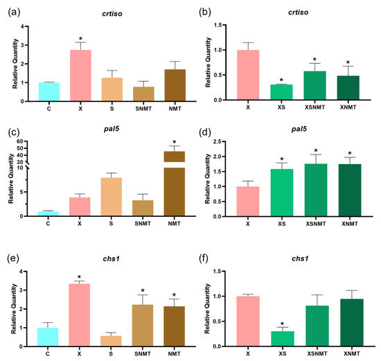 Expression levels of genes related to the carotenoid (crtiso) and the phenylpropanoid pathway (pal5 and chs1), quantified by RT-qPCR. (a,c,e) represent the levels of the uninfected/treated groups, plus the positive control (X), compared to the uninfected/untreated control (C); (b,d,f) represent the levels of the infected/treated groups compared to the positive control (X). All values are presented as mean ± SD (n = 3). Means marked with “*” are statistically different according to the Dunnett comparison test (p < 0.05). C: uninfected untreated shoots; X: infected untreated shoots; S: uninfected shoots treated with S. montana EO; SNMT: uninfected shoots treated with S. montana EO + NMT formulation; NMT: uninfected shoots treated with NMT; XS: infected shoots treated with S. montana EO; XSNMT: infected shoots treated with S. montana EO + NMT formulation; XNMT: infected shoots treated with NMT.
