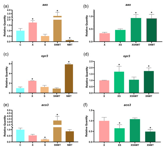 Expression levels of genes related to the ABA (aao), JA (opr3) and ethylene (aco3) pathways in tomato shoots, quantified by RT-qPCR. (a,c,e) represent the levels on uninfected/treated groups, and the positive control (X), compared to the negative control (C); (b,d,f) stand for the levels of infected/treated groups compared to the positive control (X). All values are presented as mean ± SD (n = 3). Values marked with an asterisk are statistically different according to the Dunnett comparison test (p < 0.05). C: uninfected untreated shoots; X: infected untreated shoots; S: uninfected shoots treated with Satureja montana EO; SNMT: uninfected shoots treated with Satureja montana EO + NMT formulation; NMT: uninfected shoots treated with NMT; XS: infected shoots treated with Satureja montana EO; XSNMT: infected shoots treated with Satureja montana EO + NMT formulation; XNMT: infected shoots treated with NMT.
