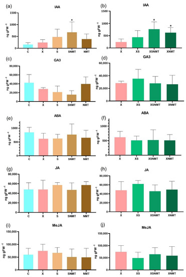 Phytohormone quantification of IAA (a,b); GA3 (c,d); ABA (e,f); JA (g,h); and MeJA (i,j) by HPLC–DAD. (a,c,e,g,i) represent the levels on uninfected/treated groups and the positive control (X) compared with the negative control (C); (b,d,f,h,j) stand for the levels of infected/treated groups compared to the positive control (X). All values are presented as mean ± SD (n = 3). Means marked with “*” are statistically different from the respective control according to the Dunnett comparison test (p < 0.05). C: uninfected untreated shoots; X: infected untreated shoots; S: uninfected shoots treated with S. montana EO; SNMT: uninfected shoots treated with S. montana EO + NMT formulation; NMT: uninfected shoots treated with NMT; XS: infected shoots treated with S. montana EO; XSNMT: infected shoots treated with S. montana EO + NMT formulation; XNMT: infected shoots treated with NMT.
