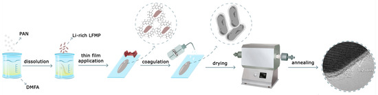 The resulting slurry was magnetically stirred for 1 h and applied on a glass surface, then rinsed with ethanol in order to activate the PAN coagulation process. The obtained thin film was washed with ethanol in order to eliminate the DMFA excess and dried under dynamic vacuum at 60 °C followed by annealing at 650 °C for 12 h, and the heating rate was 3 K/min. As a reference sample, a Li-rich LFMP/C composite with glucose as a carbon source was obtained. For that, the active material was mixed with 10% mass of glucose dissolved in ethanol and stirred for 1 h. The slurry was dried at 80 °C under dynamic vacuum and annealed at 650 °C for 12 h, with the heating rate being 3 K/min.