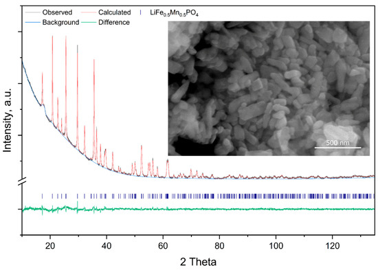 Rietveld refinement of the XRD pattern of the as-prepared LFMP. Inset: SEM image of the as-prepared material.