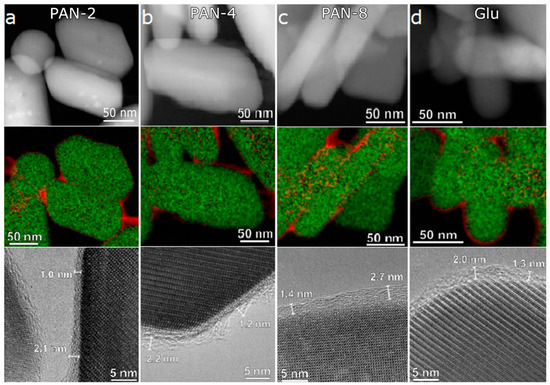 DF-STEM images and colored STEM-EELS maps of PAN-2 (a), PAN-4 (b), PAN-8 (c), and Glu (d); red color represents the EELS signal from carbon layer, while green color is overall inorganic signal from the sample.