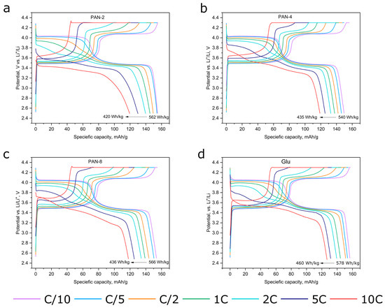 Charge–discharge profiles at C/10–10C rates of PAN-2 (a), PAN-4 (b), PAN-8 (c) and Glu (d).