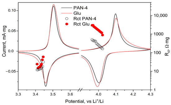 The charge transfer resistance in the single-phase regions and CVs of PAN-4 and Glu samples.